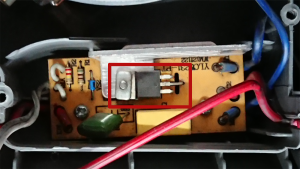 こじんまりとした基盤が見えてきた。載ってる電子部品も数えられる程度なので原因究明は簡単そう。・・・というか基板丸ごと交換してしまいたいくらいだ。しかしながら出所がよくわからない掃除機で公式サイトも皆無のようなので基板だけ取り寄せられるわけもない。
